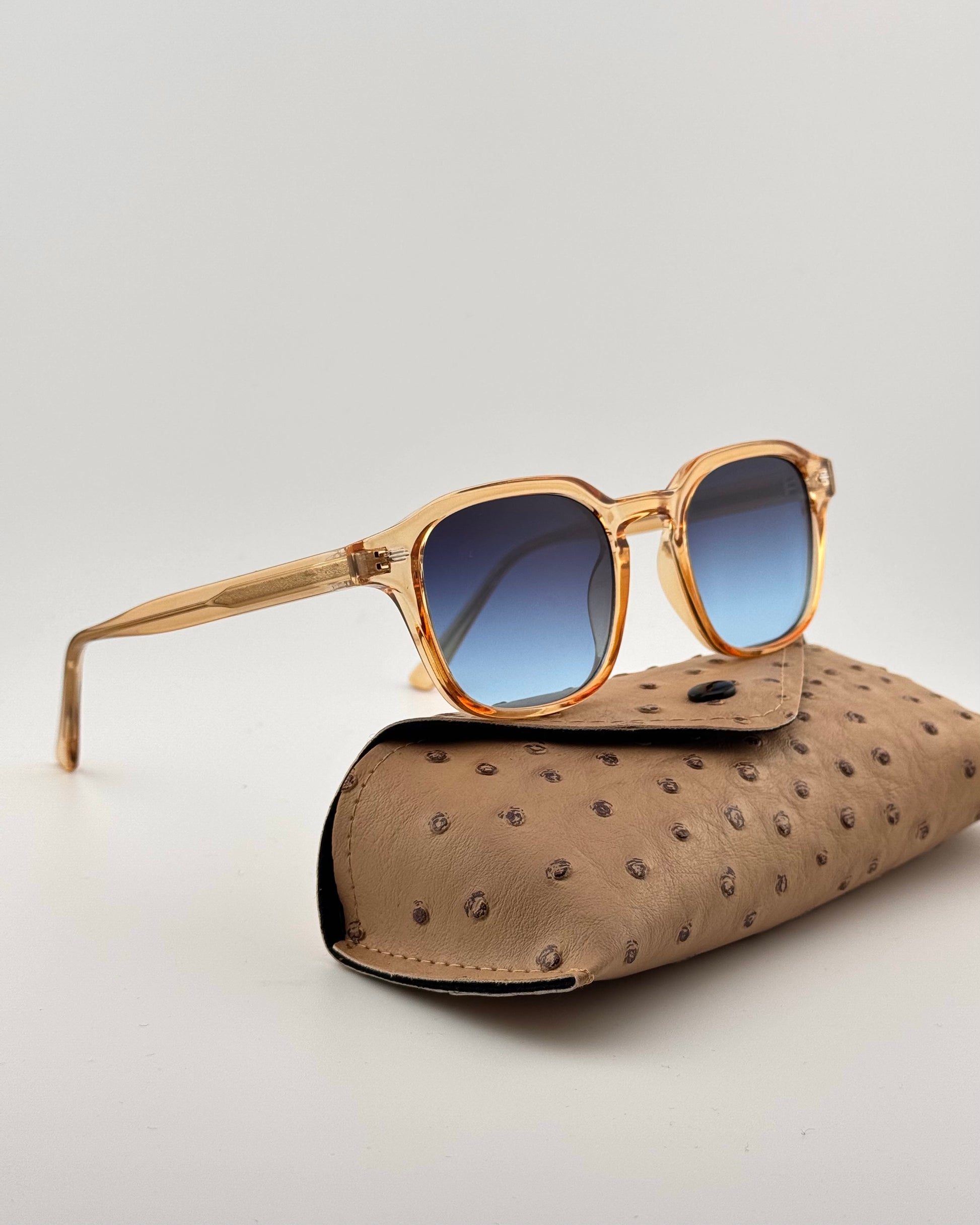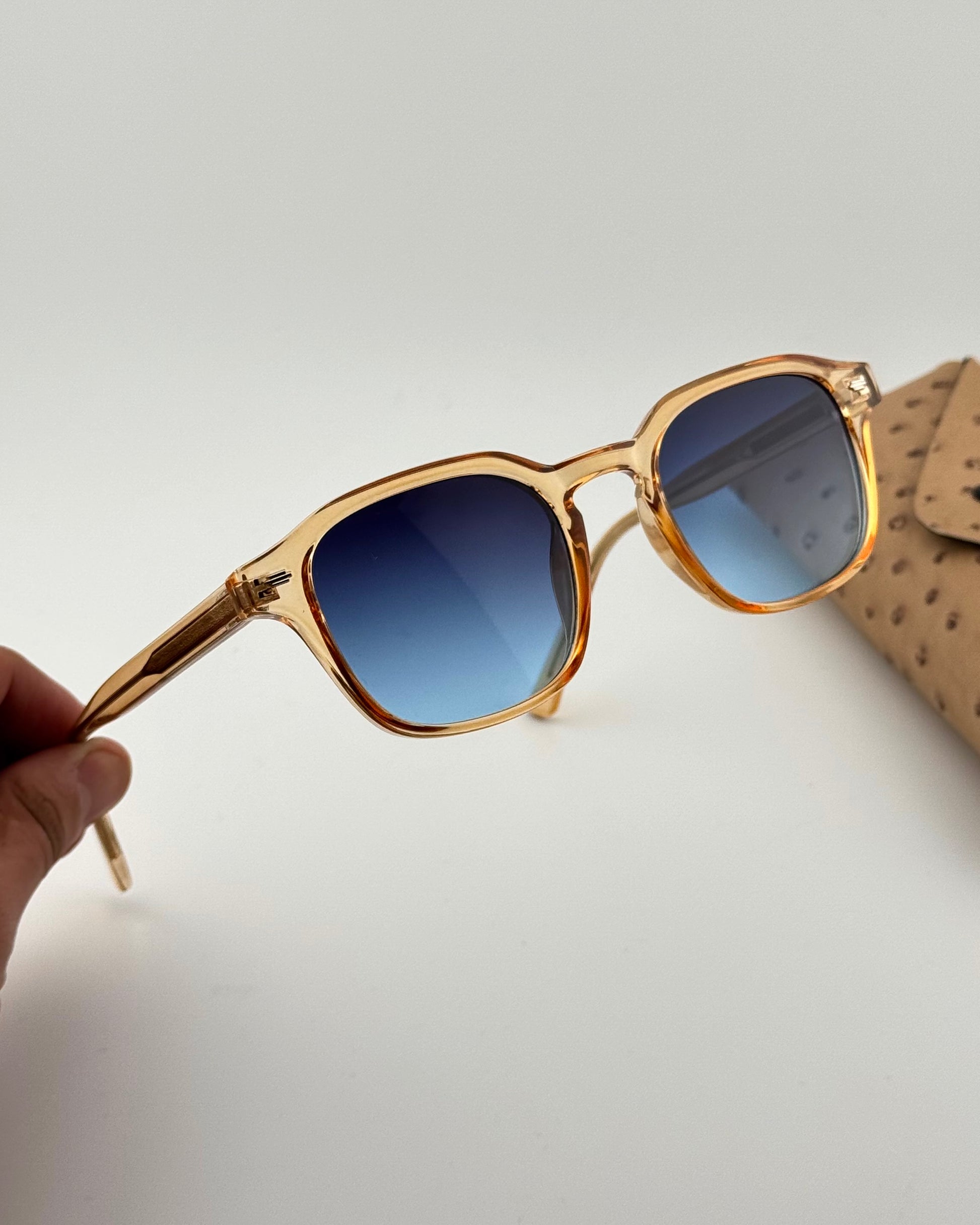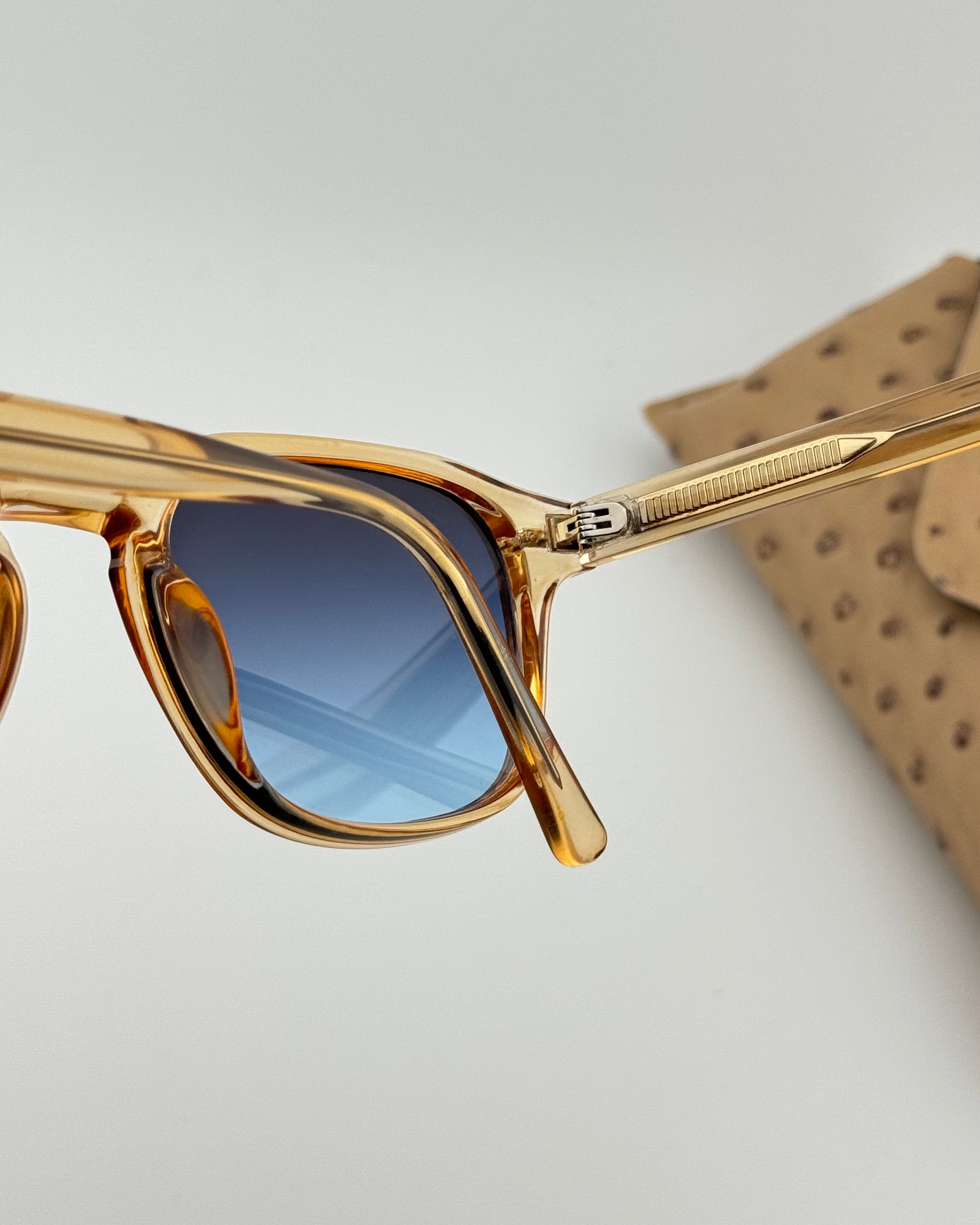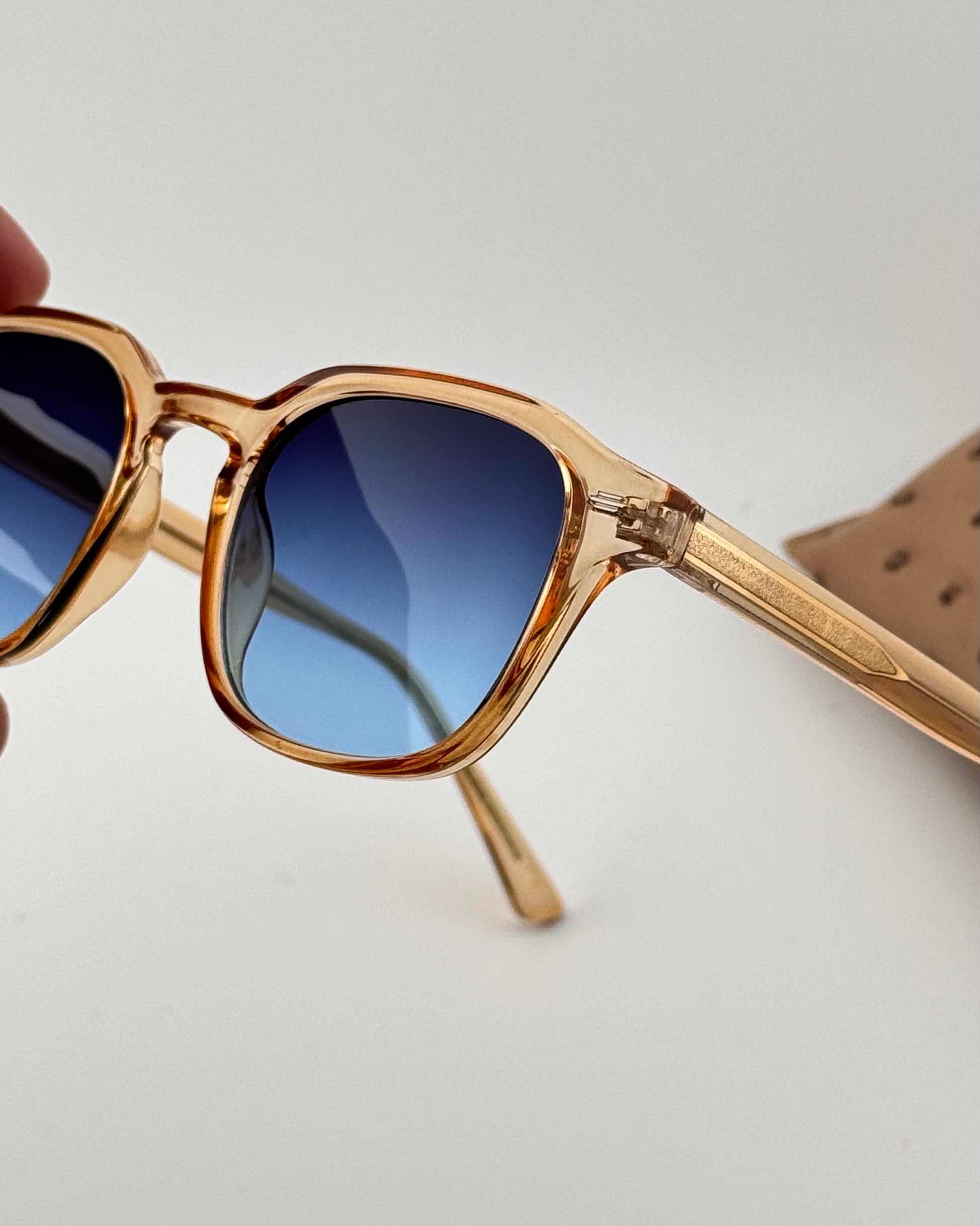Lunettes de Soleil de luxe sur une base de monture marron transparent avec un très beau détail argenté à l’interface de la branche grâce à l’injection d’aluminium à l’intérieur du cadre en acétate.