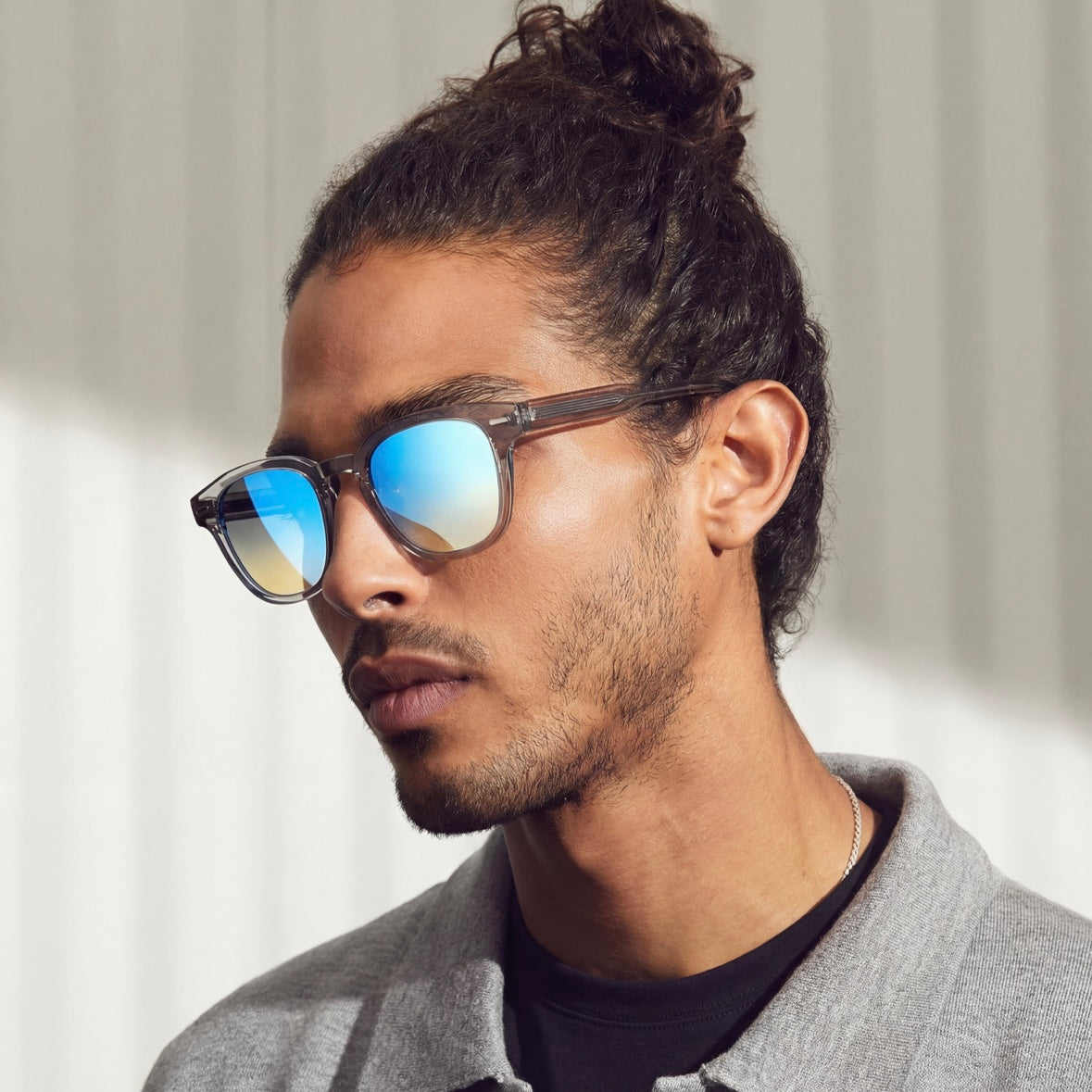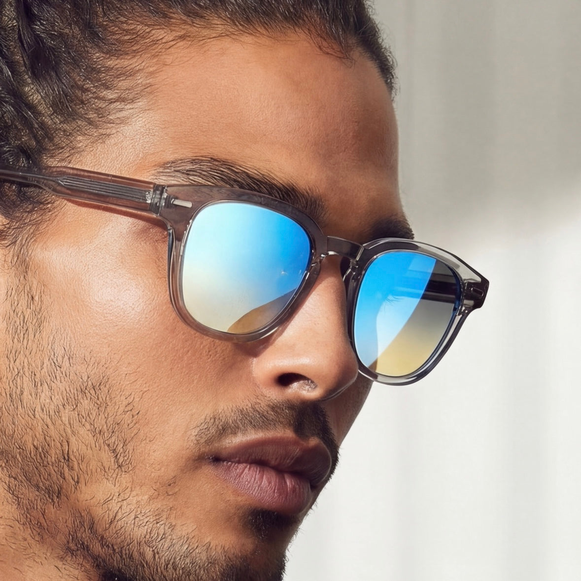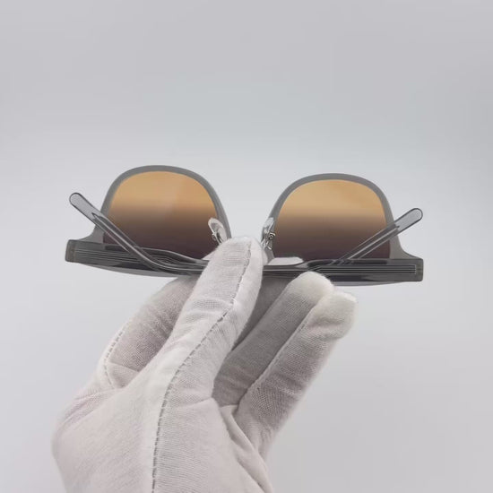Sa silhouette structurée, inspirée des formes architecturales intemporelles, épouse naturellement le visage pour une allure à la fois affirmée et élégante. Les verres dégradés à effet miroité, dotés d’un double reflet distinctif, offrent une signature visuelle contemporaine tout en assurant une protection UV optimale.